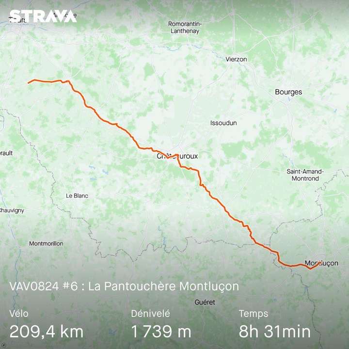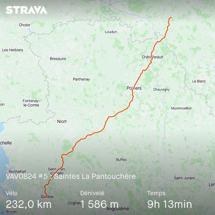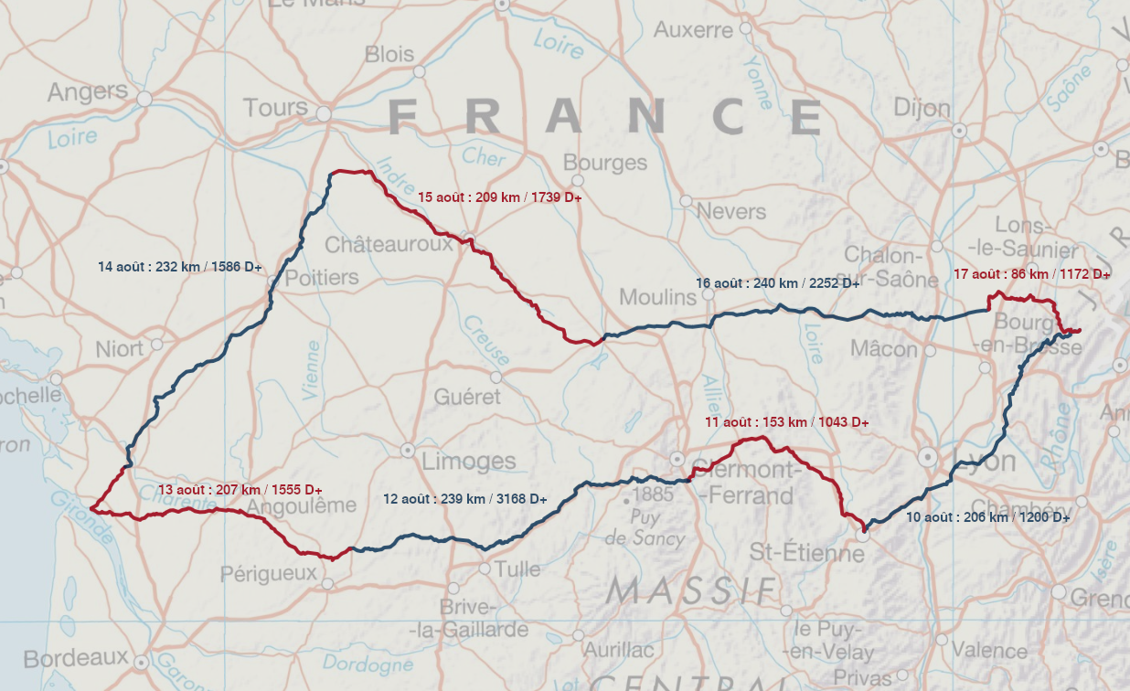 Périple à vélo 2024 pour aller voir les amis et la famille : 1574 km de vélo avec 13714 m de D+ en une semaine (départ samedi 10 août midi, retour samedi 17 août peu avant midi, juste à temps pour voir passer le tour de France femmes à Saint-Claude !) et 8 étapes, 61h49 sur la selle. Beaucoup de plaisir à pédaler, à admirer jolis paysages et beautés architecturales, et à passer du temps avec Rayan, Gabrielle, Marie-Hélène, Bernard, Lucile, Marie, Werther, Séverine, Didier, Clara, Marie-Christine, Daniel, Guillaume, Caroline, Célestine, Fleur, Zélie, Hélène, François, Grégory, Virginie, Isaac, Rafael, Daneel et Thibault ! Merci à toutes et tous pour votre accueil et les bons moments passés ensemble !